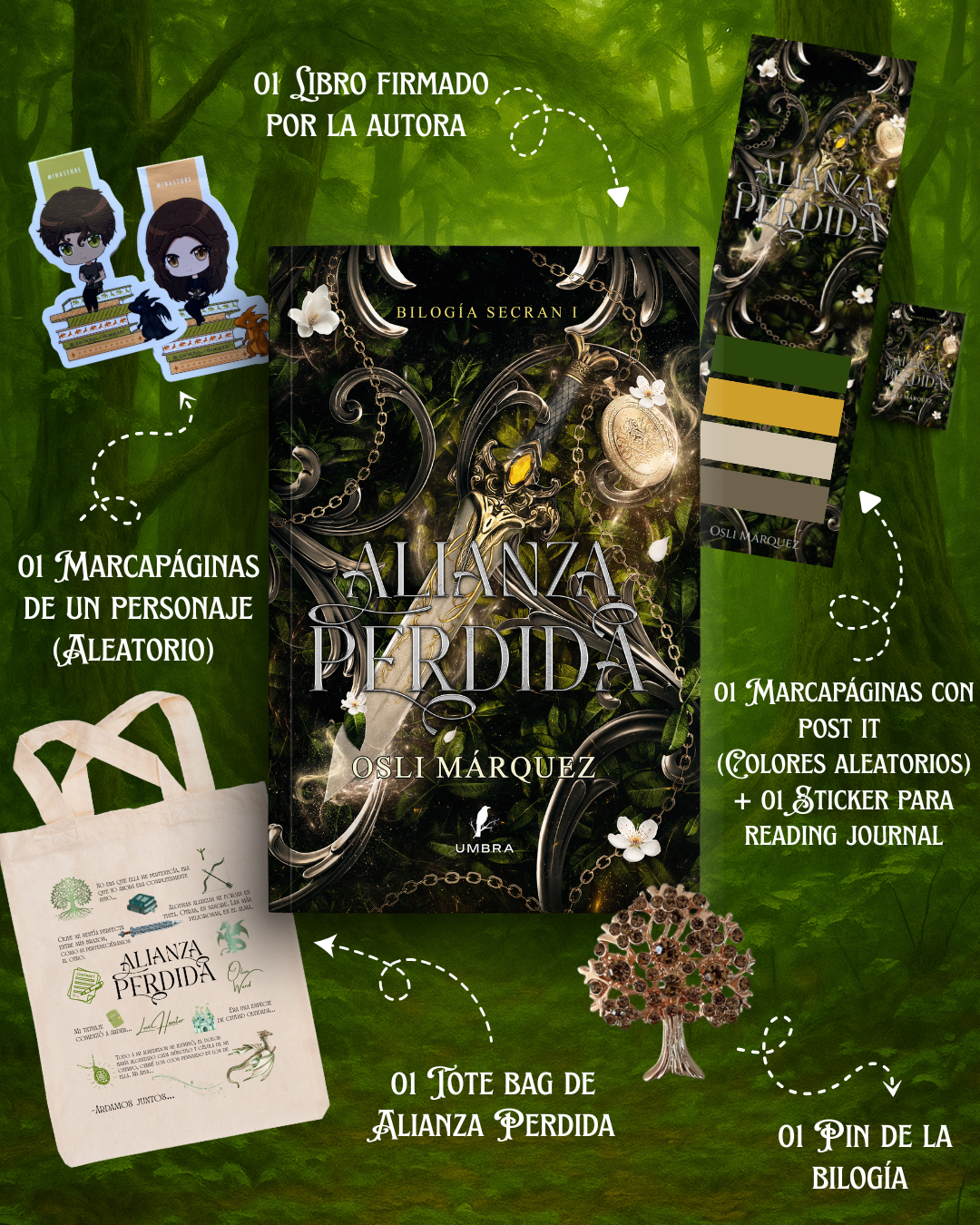 Caja Alianza Literaria: libro firmado, marcapáginas exclusivos, pin coleccionable, tote bag, y sorpresas mágicas. La experiencia completa para fans y nuevos lectores. ✨
